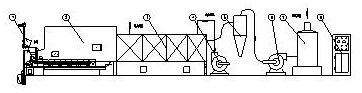 1、上煤機 2、燃燒爐 3、換熱器 4、送風機5、除灰除塵器 6、煙氣引風機 7、水膜除塵器 8、電控柜